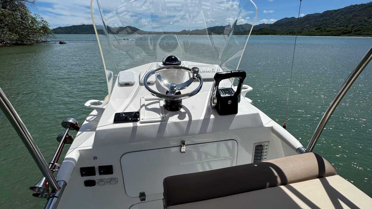 The "Campari Spritz" it's our new speedboat, 42 feet long by 14 feet wide, with 2 Suzuki Twin 250 HP outboard motors, it has 3 rooms with cushions, a bow toilet, a captain's tower, plus Shimano reels, stabilizers, Humminbird GPS, sonar, fish finder, music radio, VHF radios, safety equipment, bait vivarium and an inside cooler.